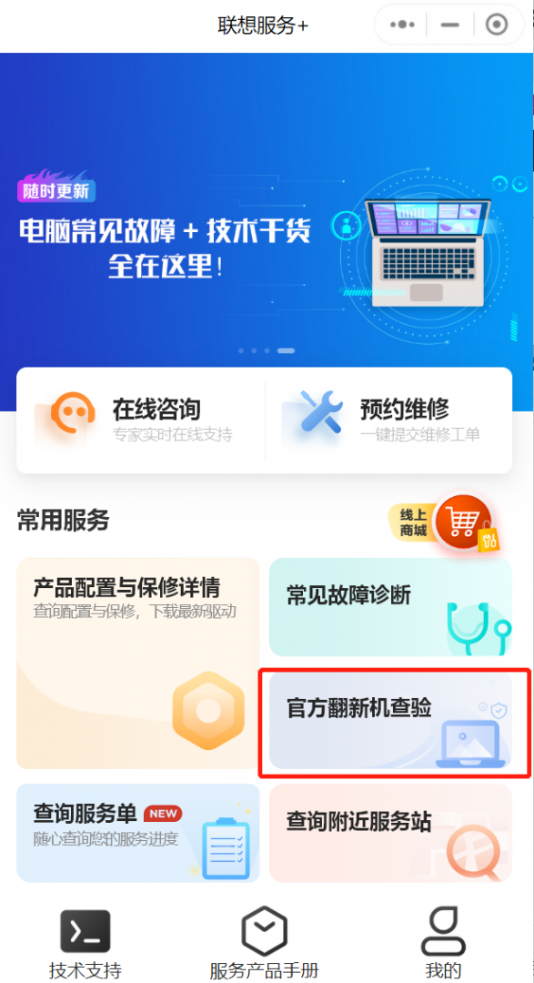 - 联想服务+小程序首页,点击【官方翻新机查验】