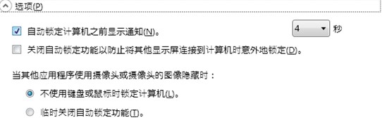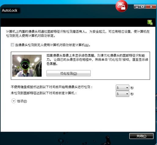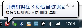 注意:当第一个条件满足后,摄像头的指示会自动开启(此时摄像头指示灯会亮),右下角会出现倒计时提示(注意:此提示需要在“选项”中选择“自动锁定计算机之前显示通知”,否则不会看到倒计时提示信息;)