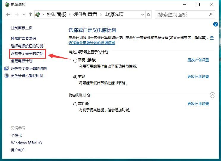 2、然后在左上角菜单选项中找到并点击“选择关闭盖子的功能”,这时就进入到了设置界面:
