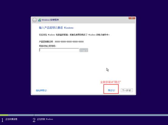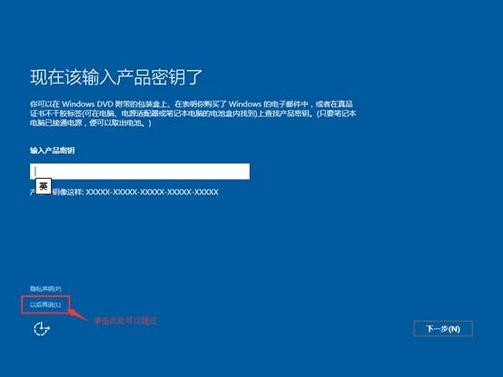 提示:如果本机已经正常升级并激活过Win10,在此跳过序列号,安装完成后照样可以联网激活;反之可能安装完成后无法正常联网激活。