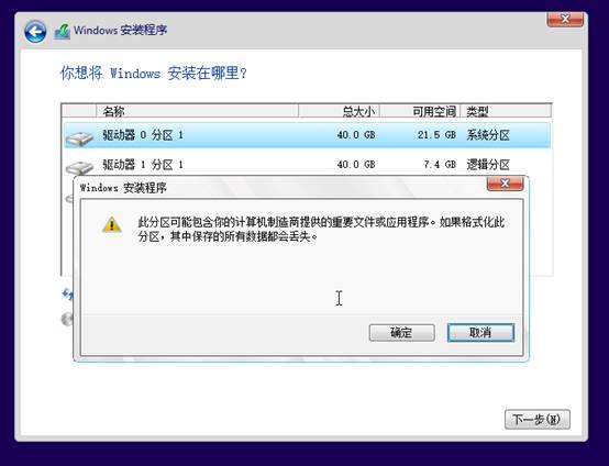 5、选择要安装WIN10的分区。如果目标分区已有系统,可以点击“格式化”格式化目标分区;如果是全新未分区的硬盘,可以点击“新建”创建分区;