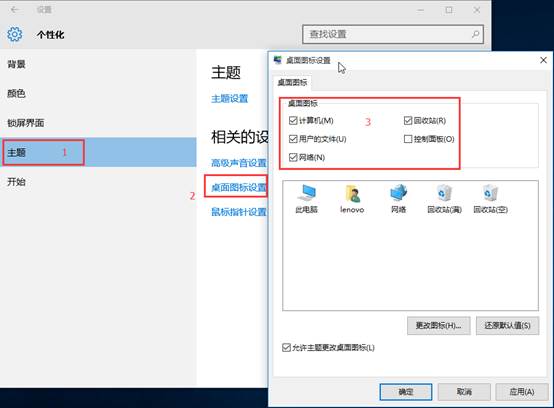 在桌面显示“计算机”等图标:在桌面点击右键,鼠标右键菜单中点击“个性化”,在“个性化”窗口中点击“主题”、“桌面图标设置”将需要显示在桌面的图标打上勾,确定即可。