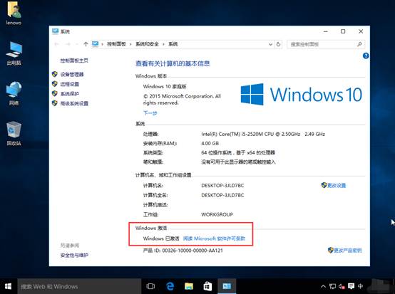 查看系统激活状态:在桌面“此电脑”图标上点击右键,在右键菜单中点击“属性”,弹出系统属性窗口,显示“windows 已激活”即可。
