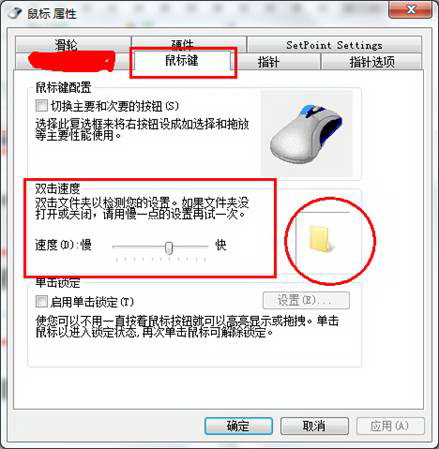 2、在鼠标键标签页中可以通过移动滑块对双击速度进行设定,设定好后可以在右侧的文件夹图标上进行测试,便于调整到习惯的速度上;如图所示: