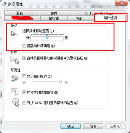3、在指针选项标签页中可以通过移动滑块对针对移动速度进行设定,此处的设定即时生效;如图所示: