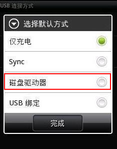 2、电脑上的Windows系统下默认会自动安装设备驱动,然后手机上会有连接模式选择,请选择“磁盘驱动器”或存储设备,如图: