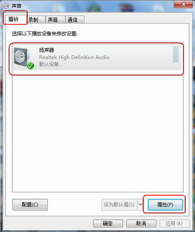 4、在弹出的“声音”对话框中,依次点击“播放”、“扬声器”、“属性”: