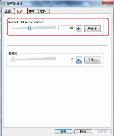 5、在弹出的“扬声器 属性”对话框“级别”选项卡中,点击“Realtek HD Audio output”右侧的“平衡”按钮: