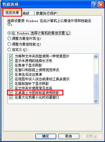 2、在“视觉效果”页中将“在桌面上为图标标签使用阴影”选中,单击确定即可如下: