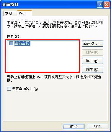 另一种方法也可轻松解决问题:右击桌面空白处,依次单击“属性/桌面/自定义桌面/web”选项,将“网页”栏中的“当前主页”以及“http//......”等所有各项前面的勾全部去掉(“http//……”为从Internet添加网页或图片的地址,一般不需要,可将它们全部删除),并将下面“锁定桌面项目”前面的勾也去掉,单击确定完成设置,就又能看到可爱的桌面图标了。 如下图: