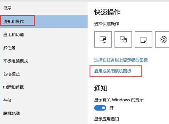 3. 选择“通知和操作”---“启用和关闭系统图标”;