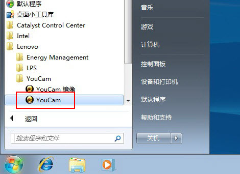 1. 在开始菜单中,顺序点击“所有程序”、“Lenovo”、“YouCam”、“YouCam”图标;