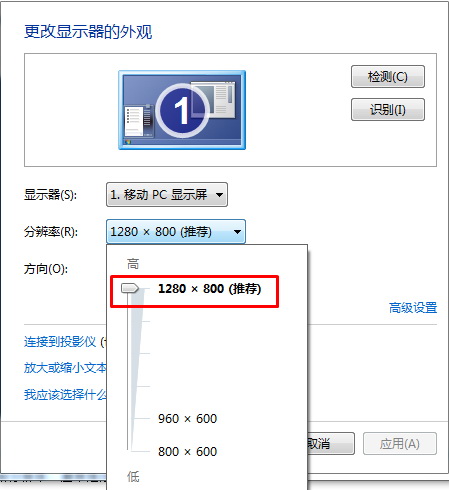 2、单击“分辨率”旁边的下拉列表,上下拖动滑块可以改变分辨率,强烈建议您设置标记为“(推荐)”的分辨率。这是当前显示器的原始分辨率,通常也是显示器可以支持的最高分辨率,该分辨率是厂商根据显示器大小而设计的适合显示的分辨率。如图: