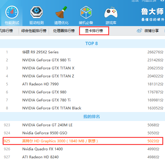 3.选择“显卡排行榜”查看您显卡的排行名次。