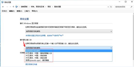 4、点击高级设置下边的“替代默认输入法”,选择需要使用的默认输入法,之后点击此页面下的保存即可。