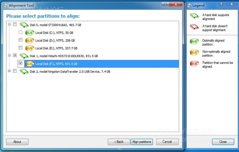 勾选黄色未对齐的硬盘或分区,然后点下面的“Align Partitons”按钮,如图: