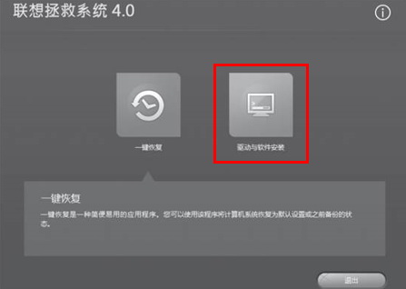 1、打开电脑电源开关,迅速连续敲击键盘的“F2”按键,启动“拯救系统”,在拯救系统的功能选项中选择“驱动与软件安装”;如图所示: