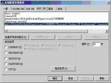 Boot.ini是在引导多系统启动时提供的参数命令,这些启动参数可以得到不同的启动效果。Boot.ini在默认的情况下加载的是/fastdetect参数,表示启动时不检查串行口和并行口。其实我们可以更改为其它参数,更改时首先在“Boot.ini”中选择需要更改的系统列表,随后将该系统中的参数/fastdetect改为相应的参数值即可。以后再启动该系统就会加载一些设置信息或画面。方法是:切换到“Boot.ini”选项卡,先选中需要更改的项目,随后在“启动选项”下端勾选需要的启动参数即可。在此对几个常用参数加以说明。