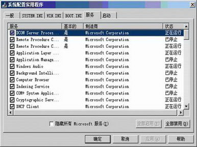 在系统配置实用程序中,可以通过选择或取消服务名称来启动或停止某服务,来判断系统是否服务出现故障,如图所示: