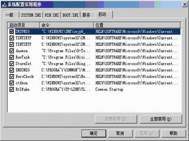启动是表示在系统启动时,加载的程序项,可以通过选择或取消程序名称来启动或停止某程序,来判断系统是否某程序出现故障或冲突,如图所示: