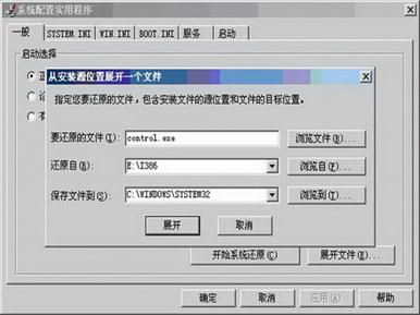 切换到“一般”选项卡,并单击其中的“展开文件”按钮,然后在弹出窗口中依次输入要还原的文件(即填入丢失的文件)名、还原自(单击“浏览自”,选择安装光盘路径)、保存文件到(选择保存文件路径),最后单击“展开”,系统会自动解压相并的.CAB文件,将指定的系统文件从安装光盘复制到电脑中,如图所示: