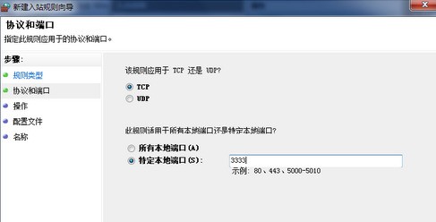 6、如图设置,输入你想打开的端口,如:3333,单击下一步;
