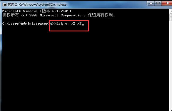 2.在打开的命令提示符窗口,输入“chkdsk g: /X /F”(其中的g为磁盘盘符,可根据您的实际盘符作修改),按回车确认。如下图所示: