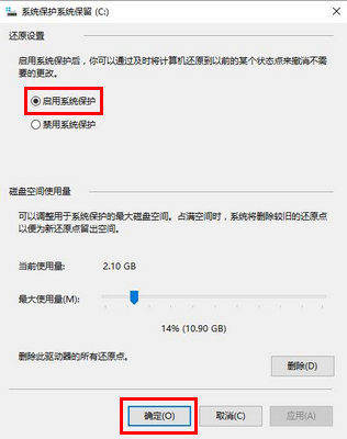 4、在弹出的窗口中,可以禁用或启用系统还原,请选择“启用系统保护”,点击“确定”,如图: