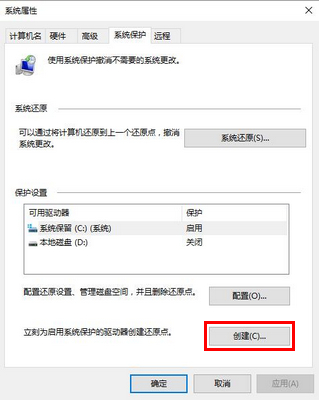 5、回到系统保护界面,点击“创建”按钮,如图所示: