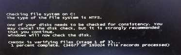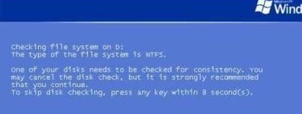 Windows系统启动过程中会检查文件的完整性,若发现有文件损坏或重要文件校验信息不正常会出现Checklisk的提示,需要进行磁盘错误检查。如下图所示: